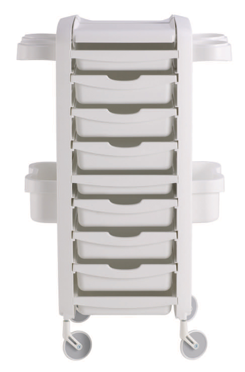 Mooie stevige werkwagen met speciale wieltjes. Kleur wit. Hoogwaardige Italiaanse merk. Veel lades voor overzichtelijk en makkelijk gebruik. Deze werkwagen is een ideale keuze voor in de kapsalon, nagelsalon etc. De werkwagen heeft een stijlvol ontwerp en heeft 8 lades voor accessoires. De bovenste en middelste lade heeft geïntegreerde houders voor haardrogers en spuitflacons. De lades zijn gemaakt van plastic en kunnen eenvoudig in – en uitgeschoven worden. De wieltjes bewegen gemakkelijk met de werkwagen mee.
